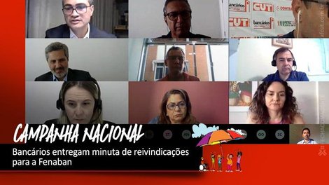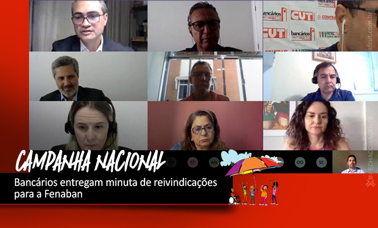 O Comando Nacional dos Bancários entregou para os representantes dos bancos nesta quinta-feira (23) a minuta com as reivindicações da categoria. Na reunião, realizada por videoconferência, foi enviado o documento para a Comissão de Negociação da Federação Nacional dos Bancos (Fenaban). Entre as reivindicações apresentadas está a de aumento real de 5%, manutenção dos direitos e da mesa única de negociação, além de questões referentes à saúde dos trabalhadores.