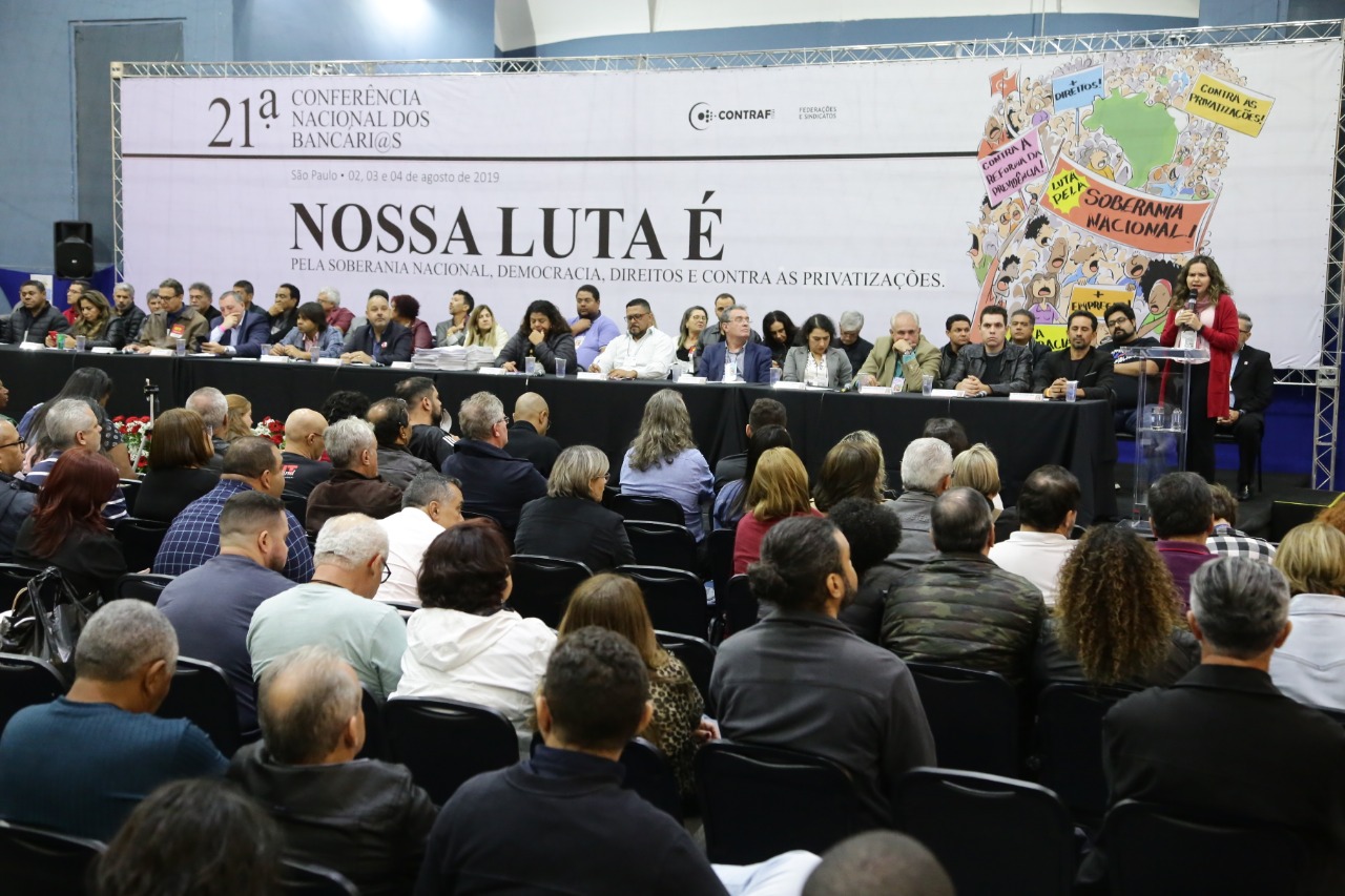 “Estamos juntos com vocês, com as frentes populares, por que nossa luta é pelo emprego, pelos direitos, pelo patrimônio nacional. Nossa luta é pelo Brasil”, disse Juvandia Moreira, presidenta da Confederação Nacional dos Trabalhadores do Ramo Financeiro (Contraf-CUT), ao declarar aberto a 21ª Conferência Nacional dos Bancários, na noite desta sexta-feira (2).