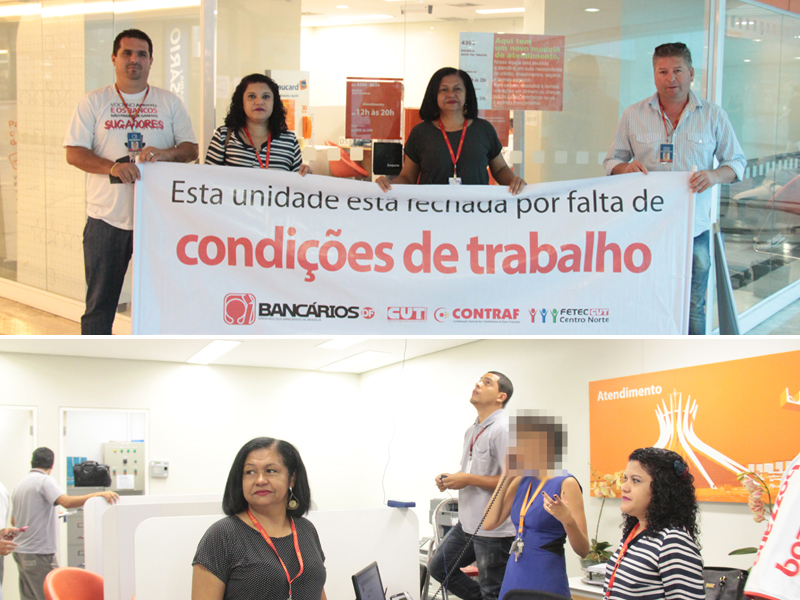 Bancários, com o apoio do Sindicato, interditaram a agência do Itaú do Pátio Brasil, nesta terça-feira (22), por falta de condições de trabalho devido ao forte calor registrado no local. Às 10h, a temperatura já passava dos 27°C, tornando impossível a permanência de funcionários e clientes na unidade, segundo constatou a diretora do Sindicato e funcionária do banco Louraci Morais.