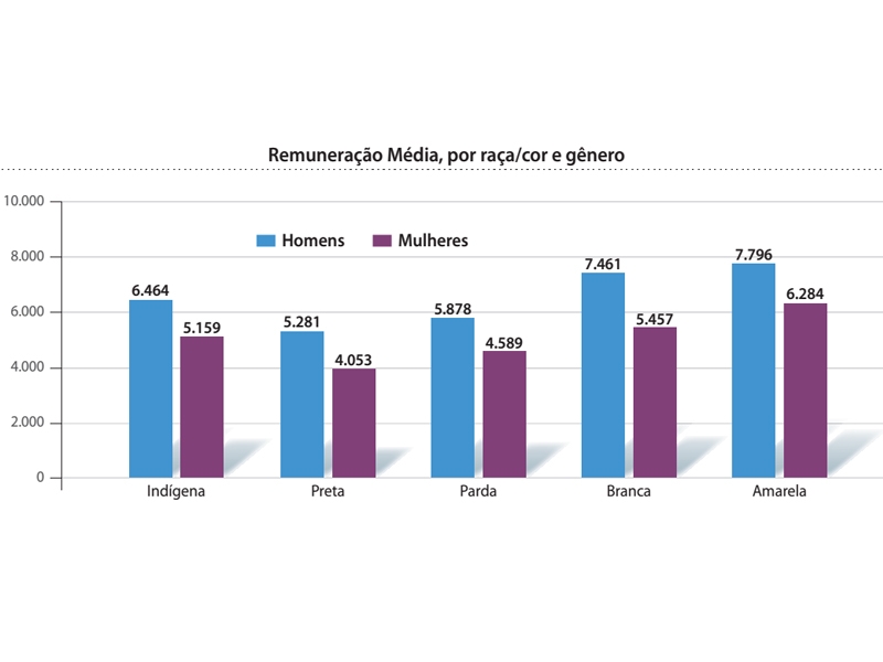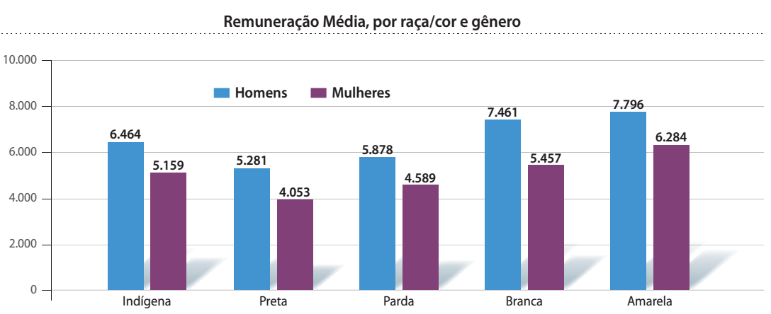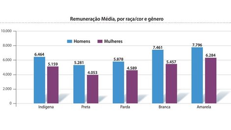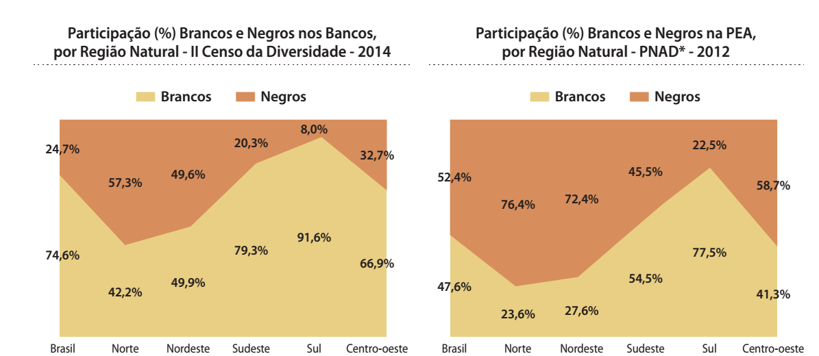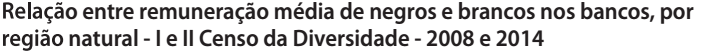 A diferença de remuneração entre brancos e negros apresentou pequena redução. Em 2008, a remuneração média dos negros representava 84,1% da auferida pelos brancos, relação que passou para 87,3% em 2014. A região com maior distância de remuneração entre negros e brancos é a sudeste, onde negros recebem remuneração média 18,8% inferior à dos brancos. Veja no quadro.