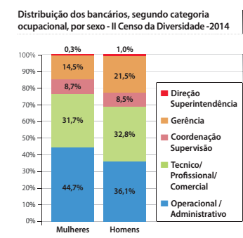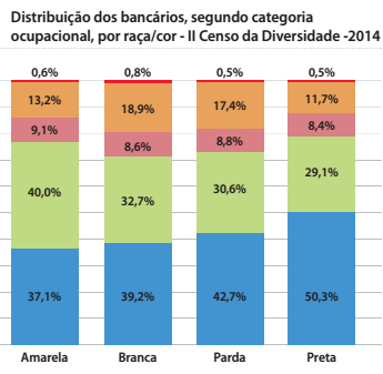 A distribuição dos cargos revela que, quando obtém emprego no banco, mulheres e negros têm restrição ao acesso a cargos de supervisão, gerência e diretoria. Conforme a progressão na carreira, há a diminuição da participação de mulheres nos cargos. Para negros, o afunilamento da participação é ainda mais intenso, chegando a atingir uma participação de apenas 4,8% nos cargos de diretoria.