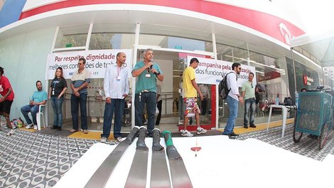 O Sindicato usou a arte como elemento de protesto por melhores condições de trabalho e atendimento durante o lançamento da Campanha de Valorização dos Funcionários do Bradesco em Brasília, nesta terça-feira 7, na agência do Setor Comercial Sul, o Bradescão, que foi paralisada das 11h às 12h.