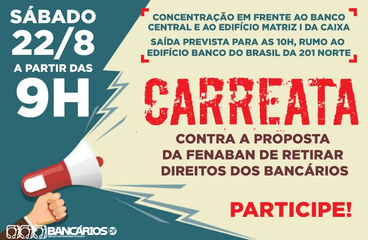 Todos e todas ao Banco Central. Concentração às 9h, rumo ao edifício do Banco do Brasil da 201 Norte. Durante a atividade, o Sindicato orienta os bancários a se mobilizarem também pelas redes sociais, usando a #CarreataDosBancáriosDF.