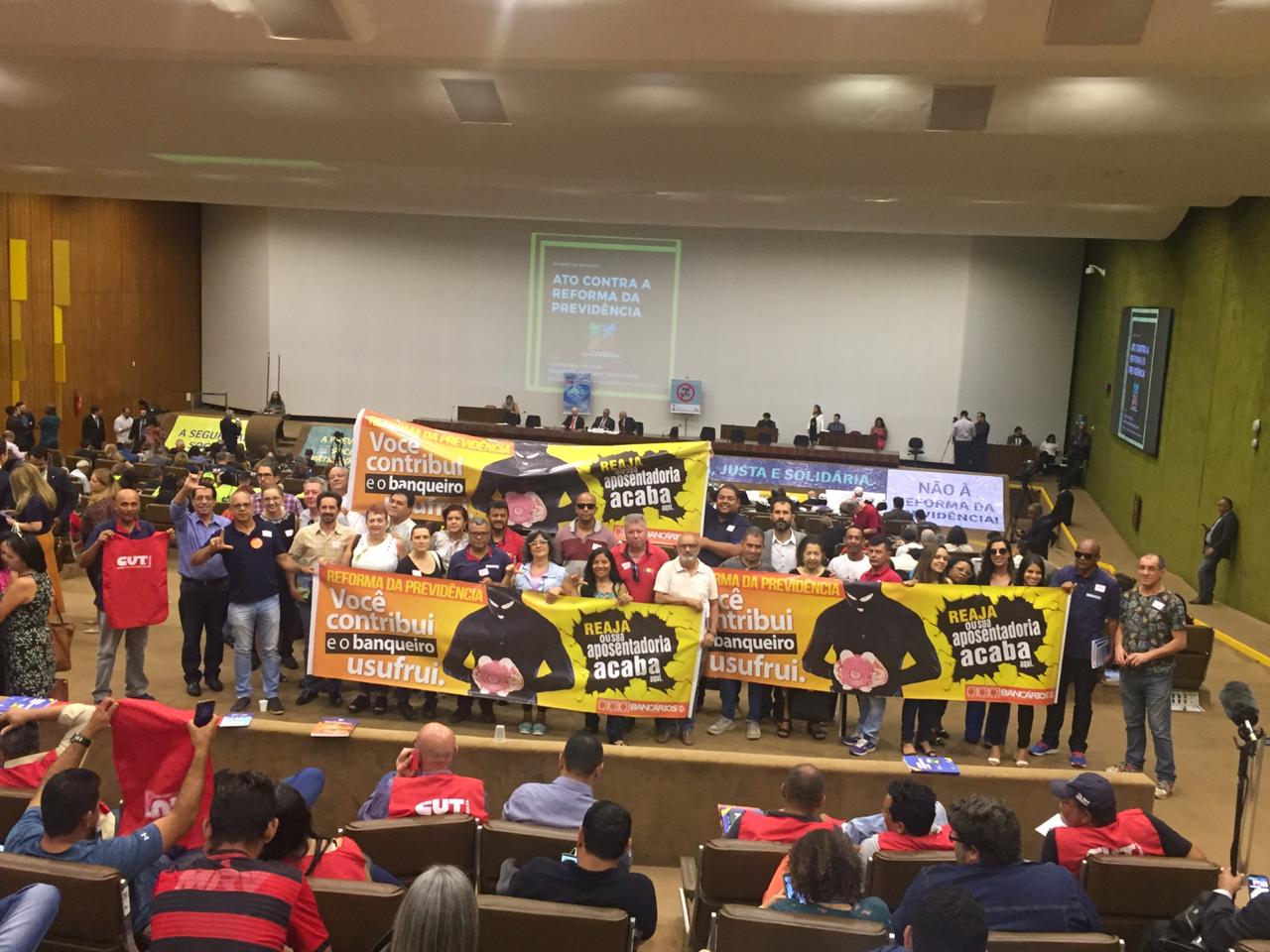 Trabalhadores, seus representantes sindicais, parlamentares e especialistas lotaram o auditório Petrônio Portela, no Senado Federal, nesta terça-feira (3), para discutir a proposta de reforma da Previdência de Bolsonaro. Presidida pelo senador Paulo Paim (PT-RS), a audiência pública referendou a posição da classe trabalhadora em defesa do direito de se aposentar. Os trabalhadores bancários foram presença expressiva no evento e aproveitaram a ocasião para protestar.