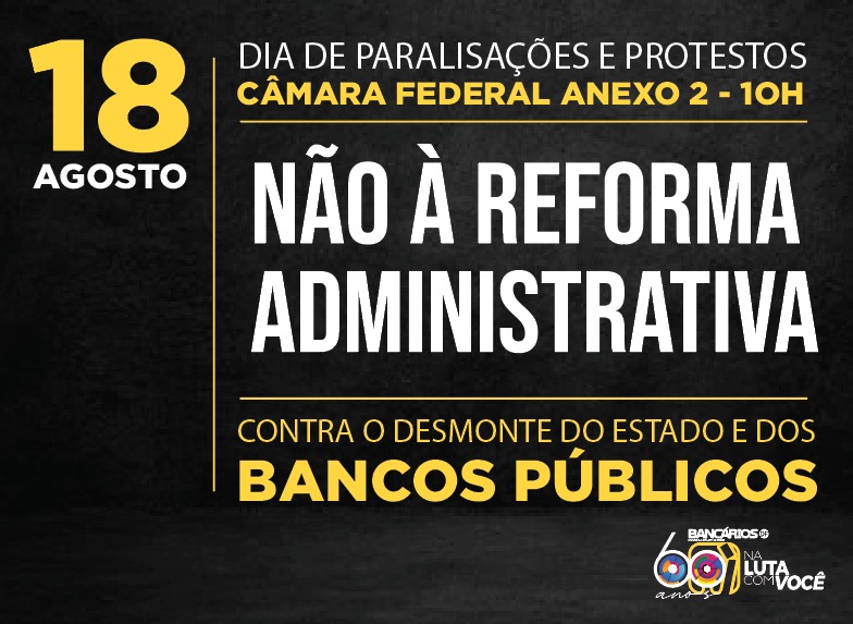 Dia 18 de agosto, quarta-feira, é Dia Nacional de Luta e Paralisações da classe trabalhadora contra a reforma administrativa (PEC 32) e as privatizações. Os servidores públicos das três esferas – federal, estadual e municipal – e os trabalhadores dos Correios realizam greve e as demais categorias protestam por todo o país.