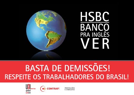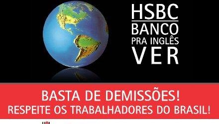 Os bancários do HSBC realizam nesta sexta-feira (22) um dia internacional de luta nos países da América Latina, onde o banco inglês atua, fazendo protestos contra as demissões, por melhores condições de trabalho, por mais respeito e pela valorização dos trabalhadores. A Contraf-CUT disponibilizou aos sindicatos um cartaz e uma carta aberta que está sendo distribuída aos clientes.