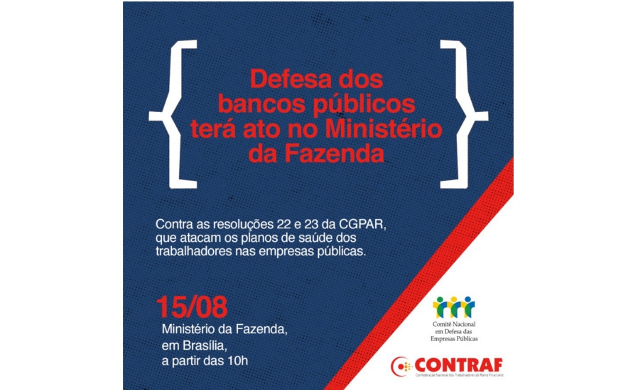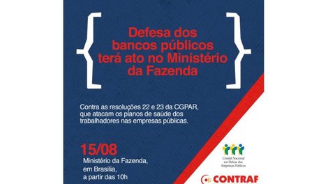 Bancários de todo o país vão realizar um ato em defesa dos bancos públicos nesta quarta-feira (15), às 10h, em frente ao Ministério da Fazenda, em Brasília. Os trabalhadores também protestarão contra as resoluções 22 e 23 da Comissão Interministerial de Governança Corporativa e de Administração de Participações Societárias da União (CGPAR). Elas determinam a redução das despesas das empresas estatais com a assistência à saúde dos trabalhadores e limitam a 6,5% da folha de pagamento a participação no custeio dos planos de saúde dos funcionários pelas empresas públicas. As medidas também proíbem a inclusão de novos funcionários nos planos de saúde das empresas públicas.