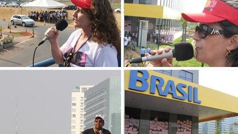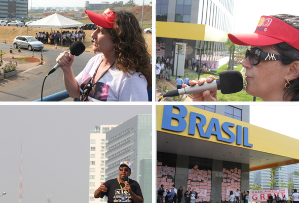 “Nós, bancárias e bancários de todo o país, queremos 16%... Também queremos mais saúde e mais segurança”, discursou a diretora do Sindicato Teresa Cristina em nome de dezenas de trabalhadores que cruzaram os braços em frente ao edifício sede do Banco do Brasil em Brasília, no Setor de Autarquias Norte (SAN), nesta quarta-feira (21).