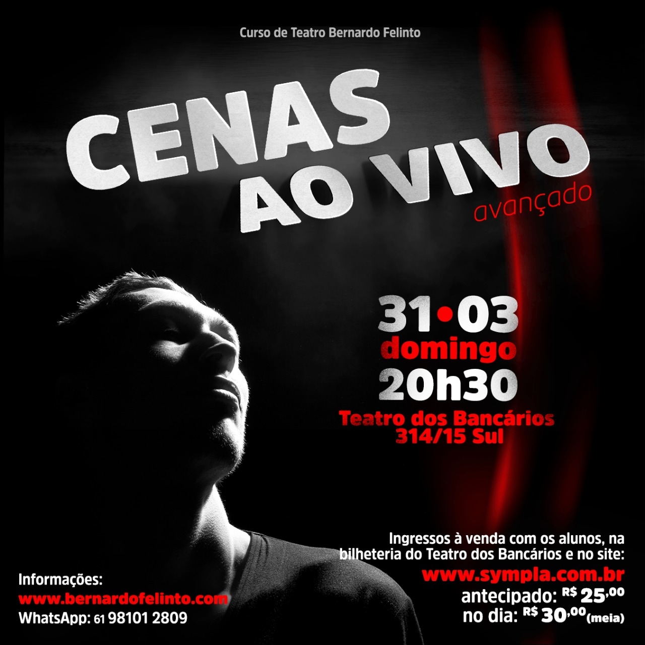 Valores: R$ 25 antecipados pelo Sympla e com os alunos do curso e R$ 30 a meia entrada no dia do espetáculo na bilheteria do teatro. Meia entrada para todos os casos previstos em lei.