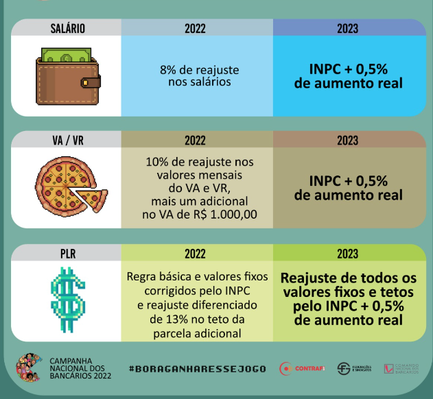 Além da manutenção de todos os direitos, as negociações realizadas pelo Comando Nacional dos Bancários levaram ao reajuste, para 2022, de 8% nos salários, aumento de 10% nos vales alimentação (VA) e refeição (VR), além de um adicional de R$ 1.000,00 em VA para compensar a alta inflação dos alimentos constada no período. Também foi conquistado reajuste de 13% para o teto da parcela adicional da Participação nos Lucros e Resultados (PLR) do ano passado.