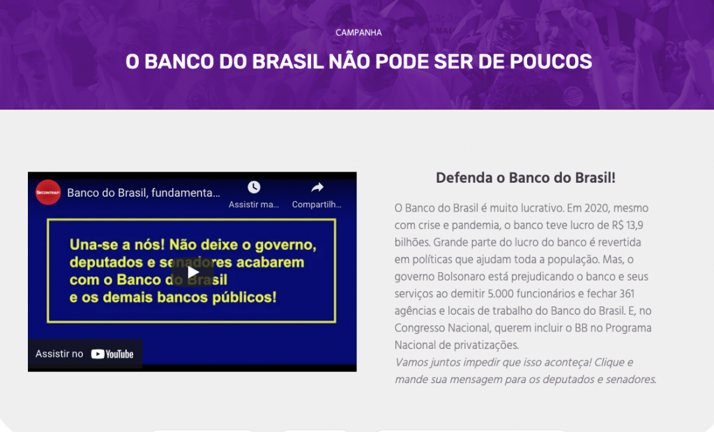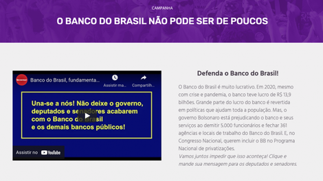 A página disponibiliza contatos com todos os parlamentares, por estados e por partidos. O objetivo é cobrar dos congressistas posição contrária à inclusão do Banco do Brasil no Programa Nacional de Privatizações.