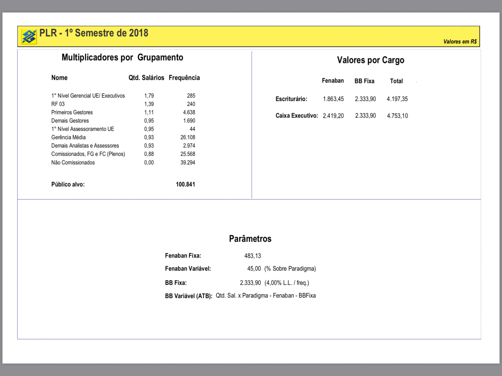 O Banco do Brasil pagará a PLR do primeiro semestre de 2018 nesta quinta-feira (6). Conforme divulgado anteriormente, o pagamento seria logo após a assinatura do acordo. Fechadas as negociações e aprovada a proposta em todo o Brasil, o acordo aditivo da PLR foi assinado no dia 31 de agosto.