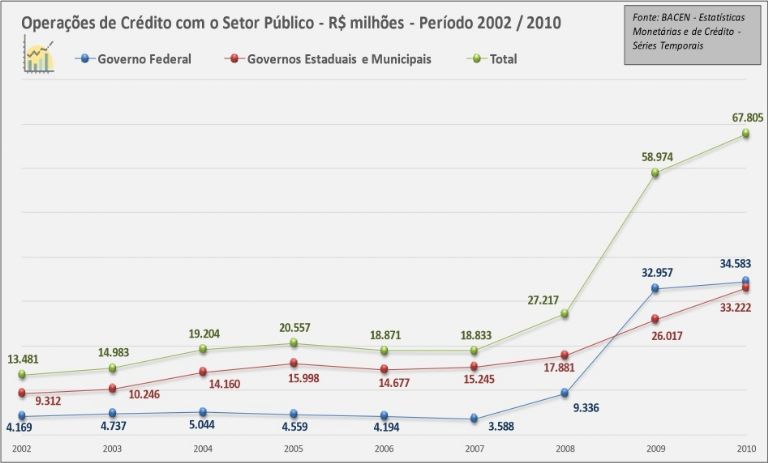 No Governo Lula (2003-2010), o volume de operações de crédito destinado ao Setor Público (Federal, Estadual e Municipal), teve um crescimento de 402,97%, passando de R$ 13.481 milhões[2] em dezembro/2002 para R$ 67.805 milhões[3] em dezembro de 2010. O crédito ao Governo Federal cresceu 729,53%, passando de R$ 4.169 milhões[4] em dez/2002 para R$ 34.583 milhões[5] em dez/2010. O crédito aos Estados e Municípios, por sua vez, apresentou um crescimento de 256,77%, passando de R$ 9.312 milhões[6] (dez/2002) para R$ 33.222 milhões[7] (dez/2010), conforme Gráfico 1 abaixo.