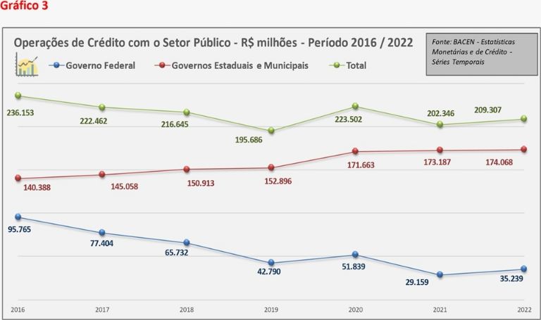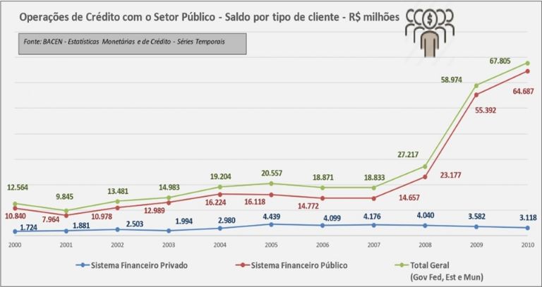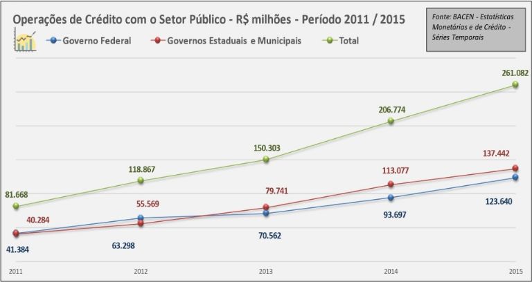 No Governo Dilma (2011–2015), o volume de operações de crédito destinado ao Setor Público (Federal, Estadual e Municipal) teve um crescimento de 219,69%, passando de R$ 81.668 milhões[1] para R$ 261.082 milhões[2], conforme Gráfico 2 abaixo.