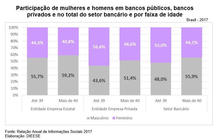 Uma pesquisa realizada pela subseção do Departamento Intersindical de Estatística e Estudos Sociais (Dieese) na Confederação Nacional dos Trabalhadores do Ramo Financeiro (Contraf-CUT) aponta que a participação das mulheres no quadro funcional dos bancos privados reduz 7,8 pontos percentuais após os 40 anos de idade. Até os 39 anos elas ocupam 56,4% dos postos de trabalho. Após completar 40 anos esse percentual cai para 48,6%. O levantamento foi feito com base nas informações da Relação Anual de Informações Sociais 2017 (Rais).
