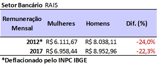 O levantamento das informações salariais do setor bancários pela Rais 2017 também apresenta diferença na remuneração entre homens e mulheres. Em 2012 essa diferença era de 24%. Em 2017 caiu para 22,3%. “É verdade que há uma pequena redução da diferença entre os salários pagos aos homens e às mulheres, mas a continuar neste ritmo, vai levar 66 anos para acabar com a diferença”, disse a presidenta da Contraf-CUT. No mercado de trabalho em geral, mantido o atual ritmo de redução, levará 42 anos para que o salário das mulheres se iguale ao dos homens.