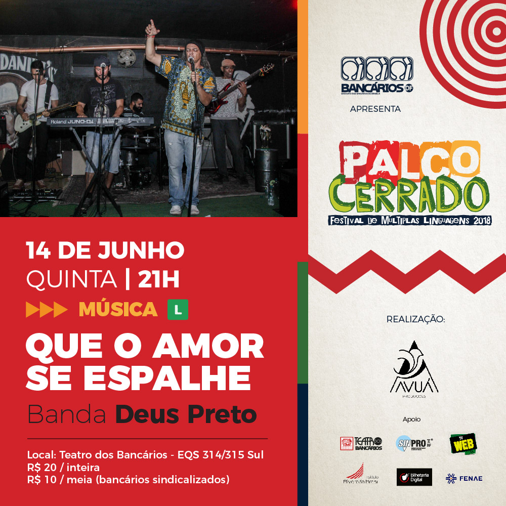 A Banda Deus Preto, com o show Que o Amor se Espalhe é a atração do Palco Cerrado – Festival de Múltiplas Linguagens 2018, que inicia sua segunda etapa de apresentações na próxima quinta-feira (14), às 21h, no Teatro dos Bancários.