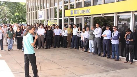 Enquanto a direção do Banco do Brasil fecha os olhos para o cumprimento da jornada de 6h em todo o país, os bancários de Brasília continuam firmes e fortes na luta pela jornada legal sem redução salarial. Nesta quarta-feira (23), foi a vez dos funcionários do edifício Sede II protagonizarem uma nova manifestação – a quinta realizada neste ano – para que o banco atenda a reivindicação histórica do Sindicato e da categoria.