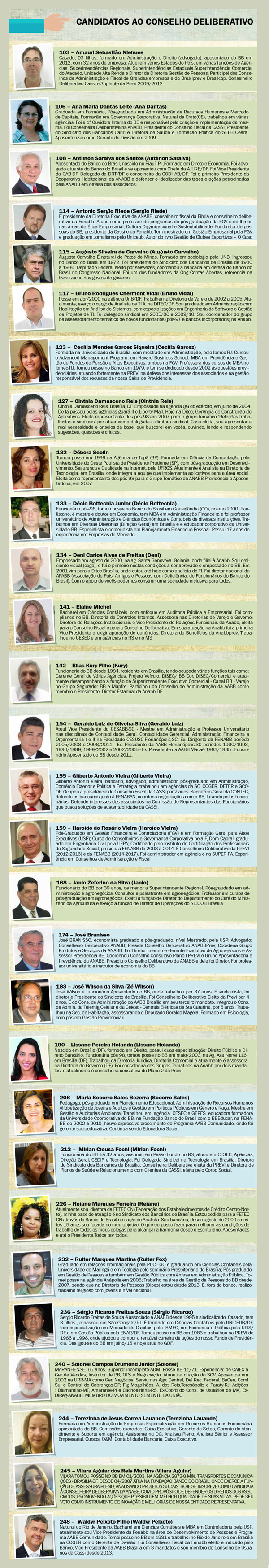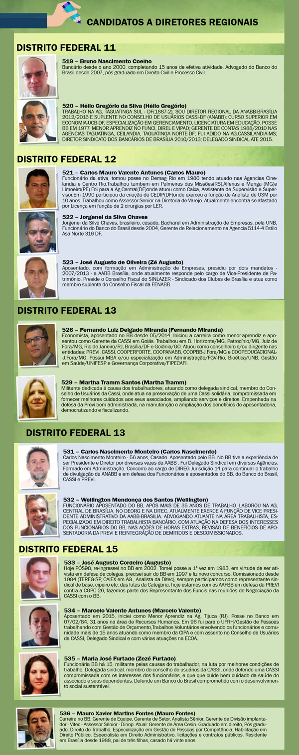 Em virtude do grande número de eleitores e candidatos, diversas bancárias e bancários estão formando grupos para divulgar suas candidaturas. Nesse sentido, o Sindicato dos Bancários de Brasília, conforme prometido, divulga abaixo a lista de seus sócios no processo eleitoral da Anabb. Vale lembrar que a divulgação das candidaturas dos sócios do Sindicato é meramente informativa.