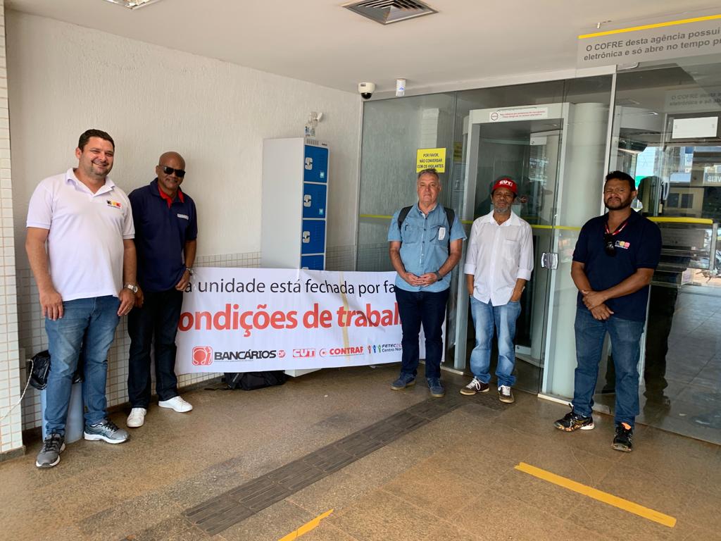O Sindicato fechou na manhã desta terça-feira (16) a agência do Banco do Brasil de Águas Lindas de Goiás, por total falta de condições de atendimento. A unidade ficará fechada até que o banco resolva dos problemas que inviabilizam o funcionamento e que já vinham sendo denunciados pelo Sindicato.