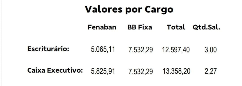A PLR do banco é composta pelo módulo Fenaban e pelo módulo BB. Pelo módulo Fenaban, o funcionário recebe 45% do salário paradigma definido no acordo, acrescido de parcela fixa. No módulo BB existe ainda a distribuição linear de 4% do lucro do banco entre os funcionários, além da parcela variável. Confira os valores na tabela abaixo.