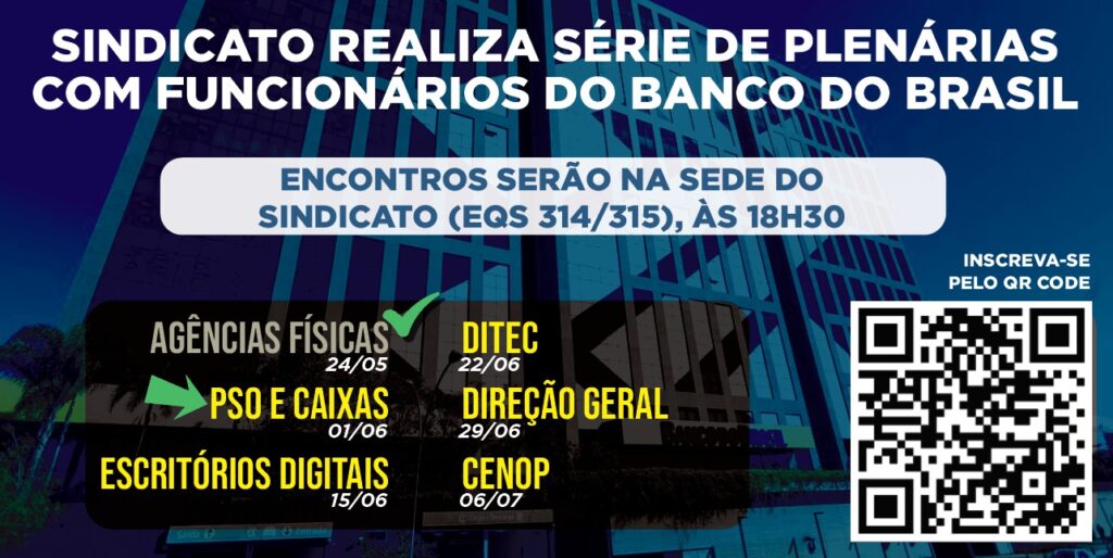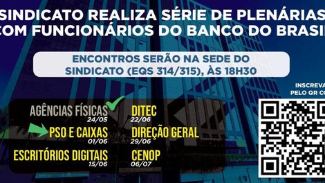 Dando sequência à série de plenárias organizadas com grupos específicos de funcionários do Banco do Brasil para debater assuntos relativos à gestão de pessoas, o Sindicato realiza nesta quinta-feira (1º), às 18h30, em sua sede (EQS 314/315 - Asa Sul), encontro com os caixas e os bancários das Plataformas de Suporte Operacional (PSOs). A primeira plenária, que ocorreu na semana passada, discutiu pontos críticos das agências.