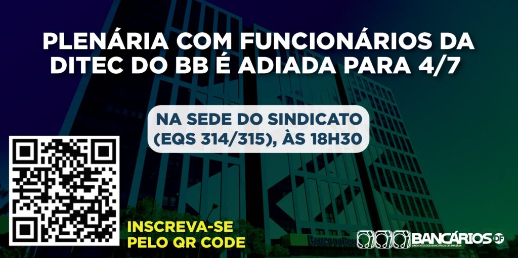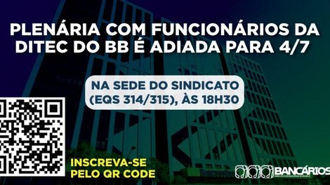 Devido a problemas operacionais e de logística, o Sindicato adiou para a próxima terça-feira (4), em sua sede, a segunda etapa da plenária com bancários e bancárias da Ditec do Banco do Brasil. A reunião será realizada em formato híbrido, às 18h30.