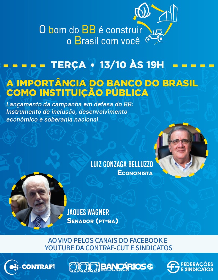 O senador Jaques Wagner (PT/BA) e o professor e economista Luiz Gonzaga Belluzzo são os convidados de terça-feira (13), primeiro dia do seminário online “O bom do BB é construir o Brasil com você – Banco do Brasil, de parabéns há 212 anos”, que abre a campanha em defesa do Banco do Brasil, encabeçada pela Confederação Nacional dos Trabalhadores do Ramo Financeiro (Contraf-CUT), sindicatos e federações de bancários. A atividade será transmitida ao vivo, a partir das 19h, pela página da Contraf-CUT no Facebook e no Youtube.