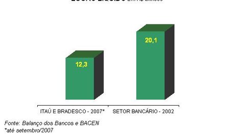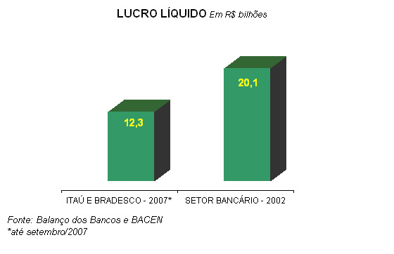 De Janeiro a setembro de 2007, o lucro líquido acumulado dos bancos Itaú e Bradesco soma R$ 12,3 bilhões. Esse valor representa 61% do lucro líquido anual do setor bancário em 2002. Entre eles, o Itaú registrou o maior lucro de todos os tempos do setor bancário, no valor de R$ 6,4 bilhões um crescimento de 112,7% em relação ao mesmo período do ano passado. A maior fonte de receita são as operações de crédito no valor de R$ 15 bi-lhões em cada um dos bancos. Esse valor é o triplo do resultado alcançado com operações de tesouraria (títulos e valores mobiliários). Veja gráfico abaixo.