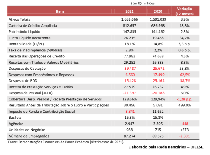 No ano passado, o Bradesco obteve lucro líquido recorrente (que exclui eventos extraordinários) de R$ 26,215 bilhões, alta de 34,7% em relação ao ano de 2020, e queda de 2,3%, comparando-se o resultado do 4o trimestre (R$ 6,613 bilhões) ao trimestre imediatamente anterior (R$ 6,767 bilhões). O Retorno sobre o Patrimônio Líquido Médio Anualizado (ROAE) do banco ficou em 18,1%, com alta de 3,3 p.p. em doze meses.
