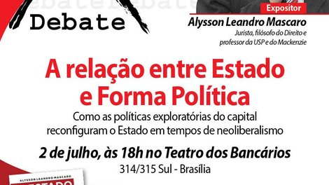 A inauguração dessa nova fase terá como tema de debate 'A relação entre Estado e Forma Política'. O objetivo é dissecar, entre outras questões, como, no neoliberalismo vigente no mundo, as políticas exploratórias do capital reconfiguram os Estados em favor da concentração econômica. A exposição do tema será feita pelo professor da USP e do Mackenzie, Alysson Leandro Mascaro, autor do livro 'Estado e Forma Política', lançado pela Boitempo Editorial. O debate será no Teatro dos Bancários (EQS 314/315) e, logo após sua exposição, o autor autografará exemplares do livro.