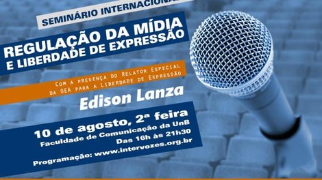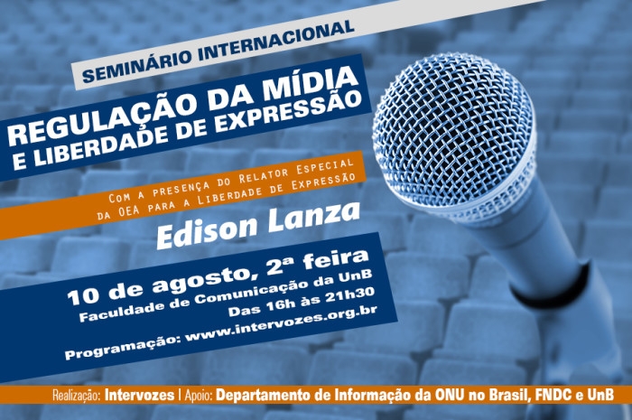 Por iniciativa do Intervozes, em parceria com o Centro de Informação da ONU para o Brasil e a Universidade de Brasília, e o apoio do Fórum Nacional pela Democratização da Comunicação (FNDC) e da Fundação Ford, acontece em Brasília, no próximo dia 10 de agosto, o “Seminário Internacional Regulação da Mídia e Liberdade de Expressão”.