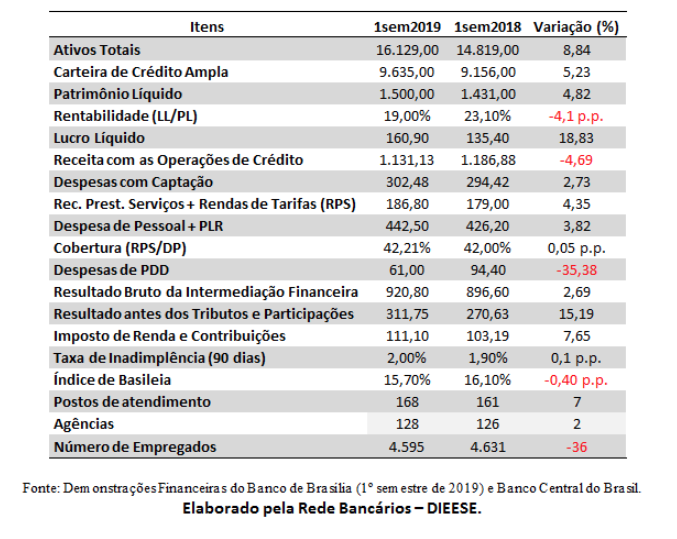 No último dia 28 de agosto, o BRB tornou público seu balanço referente ao primeiro semestre de 2019. O Sindicato, através de sua subseção do Dieese, fez uma análise do balanço e apresenta dados relevante sobre ele.