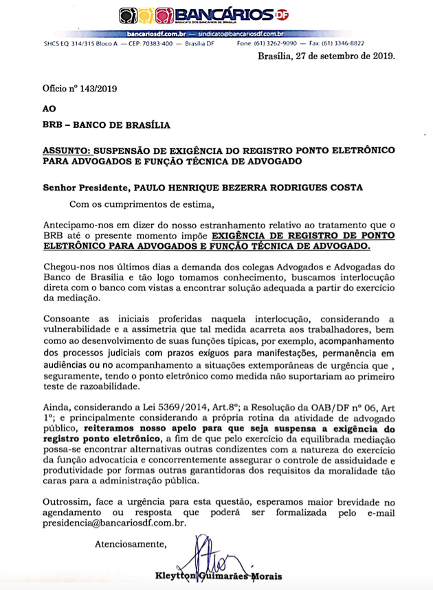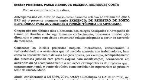 Em ofício encaminhado nesta sexta-feira (27) ao presidente do BRB, Paulo Henrique Costa, o Sindicato reforça o pedido de suspensão da exigência de registro para os advogados e para a função técnica de advogado.