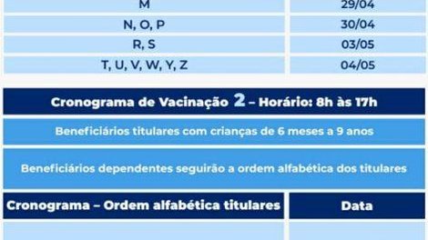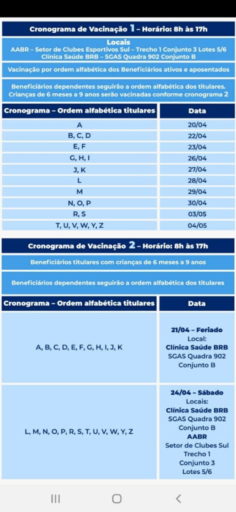 A vacinação será realizada na AABR (Setor de Clubes Esportivos Sul – Trecho 3, Lotes 5/6) e na Clínica Saúde BRB (SGAS Quadra 902, conjunto B). Veja abaixo o cronograma da imunização.