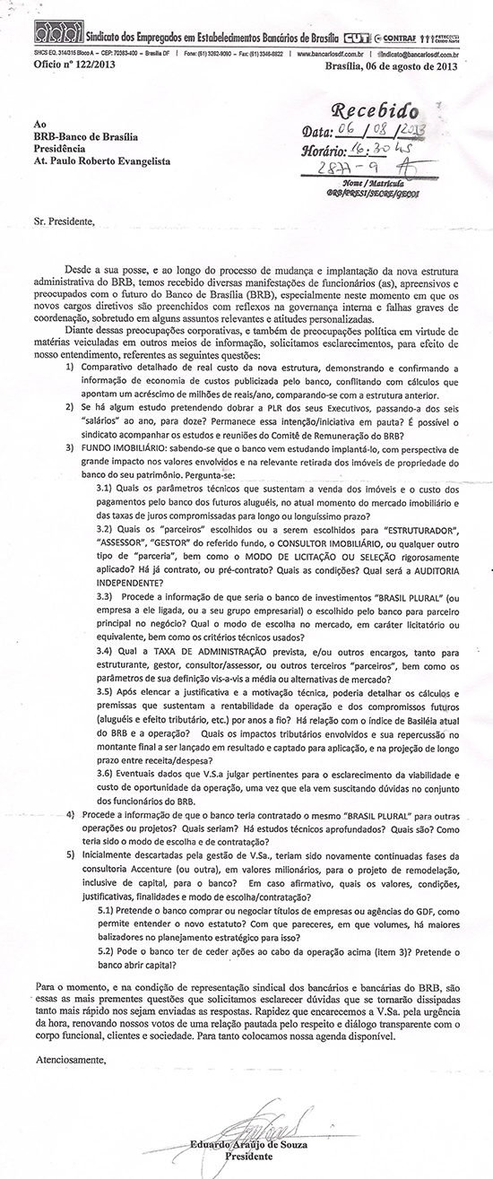 O Sindicato e os funcionários do BRB, bem como toda a sociedade do Distrito Federal, esperam respostas da diretoria do BRB.