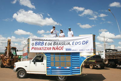 Dando continuidade aos atos públicos contra a privatização do BRB, o Sindicato realizou manifestação, no sábado 12, na cidade-satélite do Riacho Fundo I. Em cima de um carro de som, diretores da entidade percorreram as principais vias da cidade. Explicaram à população a importância da manutenção do BRB público.