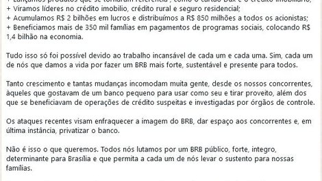 Quando fala de união por um BRB público e forte, aparece uma contradição. Além de não citar iniciativas claras de como se dará essa união pelo BRB público e forte, parece um contrassenso para uma gestão que tem estratégias de negócios questionáveis, passíveis de serem criticadas e aparentemente utilizadas para enfraquecimento da instituição. Que tem uma gestão de pessoas assediadora, que deixa os empregados, sejam da Direção Geral ou das agências, doentes devido a metas e objetivos quase inatingíveis - ou o quanto essa gestão pressiona os empregados para “correrem atrás” do gasto já feito.