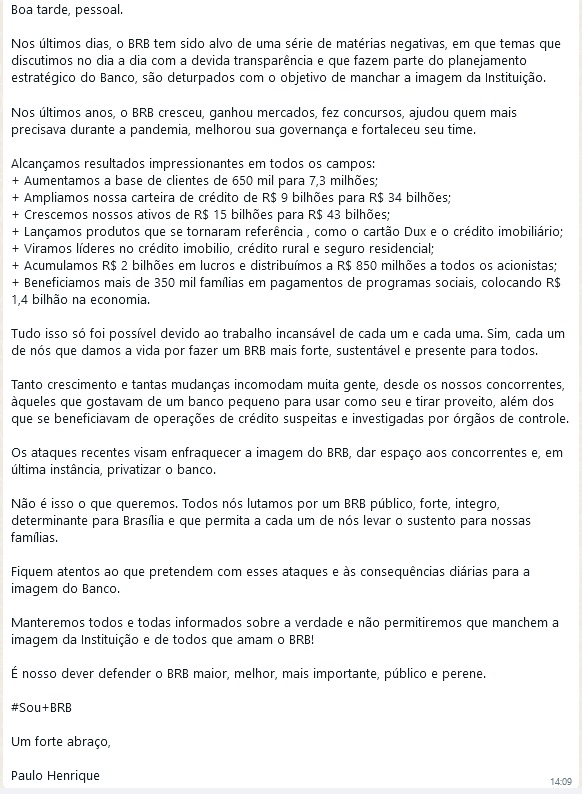 O presidente do BRB, Paulo Henrique Bezerra Rodrigues Costa, lançou um texto para os empregados do conglomerado como “tentativa” de responder as críticas que estão se avolumando na imprensa. Todavia, com tem sido a tônica no andamento desta gestão, ele interpreta os fatos de maneira muito “bondosa” com a sua gestão. Vamos aos fatos: