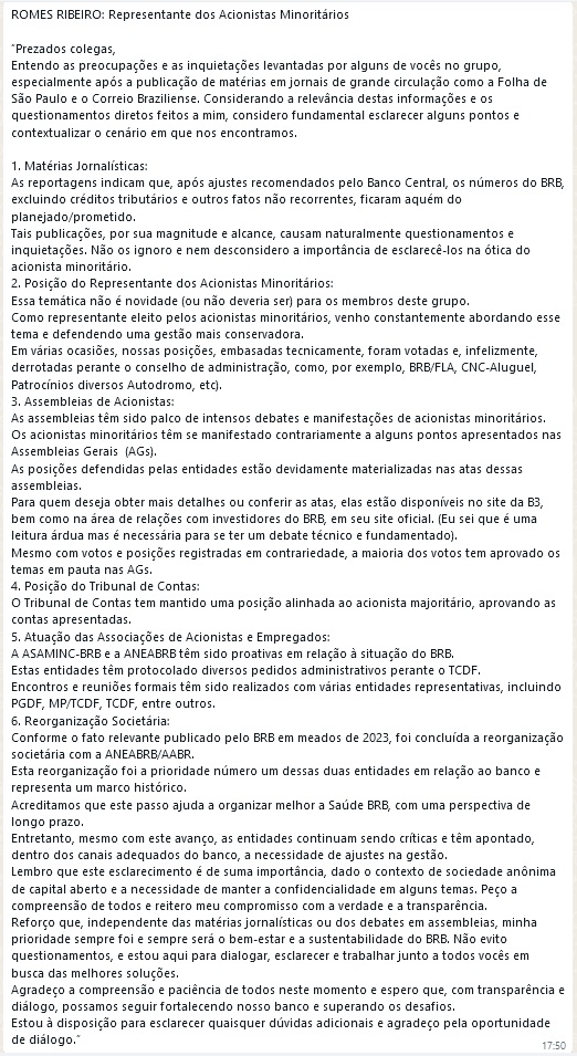 O texto traz como objetivo responder algumas críticas, todavia, rapidamente volta ao seu mundo cor-de-rosa, quando foge das críticas e cita realizações do banco de forma muito benéfica à instituição, principalmente quando cita o aumento da quantidade de clientes, ligado principalmente aos clientes do Banco Nação Fla, que, como já noticiado, não traz retorno ao BRB. Ou seja, número vazio. Importante salientar também a necessidade de registrar o resultado do período todo da gestão, uma vez que isso esconde a queda vertiginosa dos resultados trimestrais do banco, principalmente nos últimos dois anos, e não explica por quê, mesmo com essa queda, continua a política de pagamentos de altos dividendos.