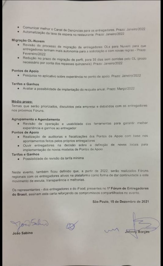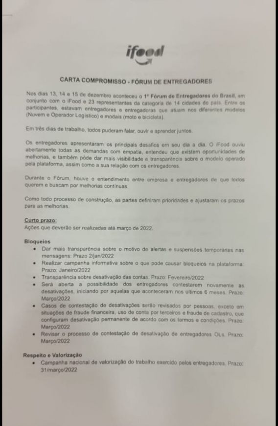 Na carta compromisso assinada pela empresa, o acordo era que, até fevereiro, reivindicações da categoria, como a transparência sobre as suspensões temporárias nas mensagens e sobre a desativação das contas dos entregadores fossem solucionadas, o que não aconteceu.