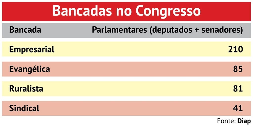 Entre as bancadas, a eleição reforçou o perfil conservador do parlamento. Os deputados ligados ao sindicalismo, por exemplo, são 41, apenas um a mais do que na legislatura anterior. Já chegaram a ser 72 (2011-2015) e durante bom tempo se mantiveram com 60 representantes. Por sua vez, a bancada empresarial na Câmara vem encolhendo, mas ainda reúne 210 nomes, ante 242 há quatro anos. Cinco vezes mais que a sindical.