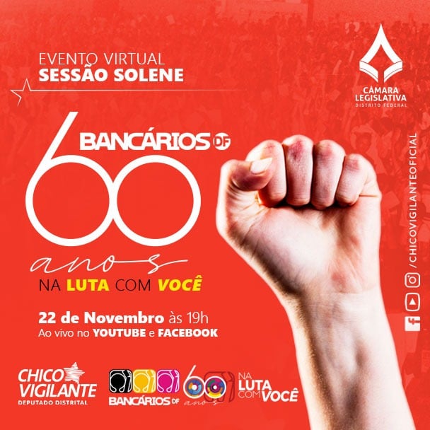 O aniversário de 60 anos do Sindicato dos Bancários de Brasília será marcado por sessão solene da Câmara Legislativa do Distrito Federal (CLDF) convocada esta segunda-feira (22), às 19h. O evento ocorrerá por meio remoto, com transmissão pelas redes sociais do Sindicato (youtube.com/bancariosbsb e facebook.com/bancariosdf).