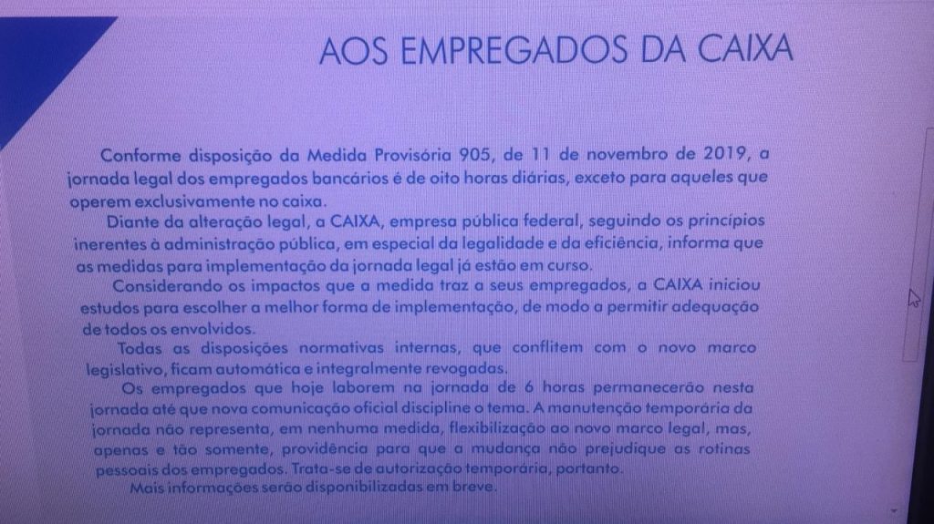 Sem qualquer negociação com o Sindicato e pegando a todos empregados de surpresa, a Caixa Econômica Federal divulgou agora há pouco um comunicado aos seus empregados em que afirma que “já estão em curso” as medidas para a “implementação da jornada legal” de 8 horas para todos os bancários, exceto os caixas, atendendo ao que determina a MP 2019 editada pelo governo Bolsonaro na última segunda (11).