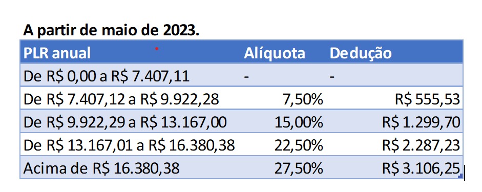 Desde 2015 não havia correção da tabela do IR. Neste ano, o governo Lula reajustou a tabela, tanto em relação ao rendimento mensal, quanto em relação aos valores recebidos a título de PLR (são tabelas distintas). A faixa de isenção da tabela da PLR passou dos R$ 6.677,55 para os atuais R$ 7.407,11, um reajuste de 10,93%. Como os valores recebidos pela categoria a título de PLR são maiores do que a faixa de isenção, há o desconto na fonte de acordo com a tabela abaixo.