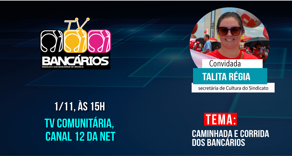 A programação da TV Comunitária de Brasília desta semana transmitirá mais uma edição do TV Bancários sobre cultura. Nesta sexta-feira, 1º de novembro, o programa recebe a secretária de Cultura do Sindicato, Talita Régia, para falar sobre a Caminhada e Corrida dos Bancários, que será realizada dia 24.