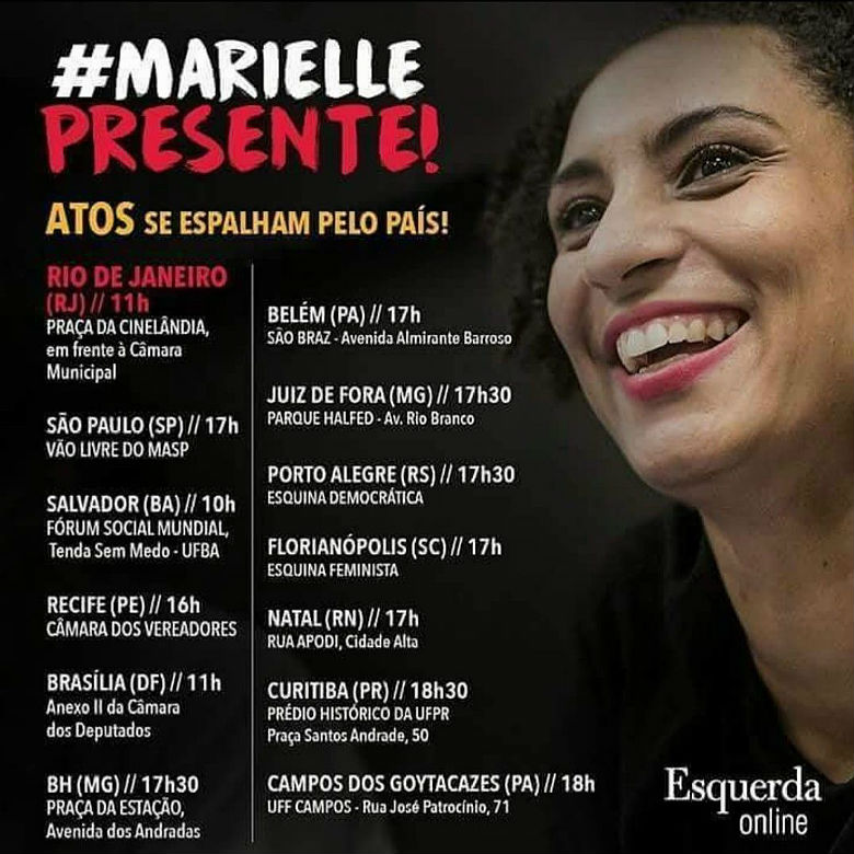 Em São Paulo, tem ato público convocado pelo Psol no vão-livre do Museu de Arte de São Paulo (Masp), na Avenida Paulista. Em Belo Horizonte, o protesto é na Praça da Estação, no centro da capital mineira.