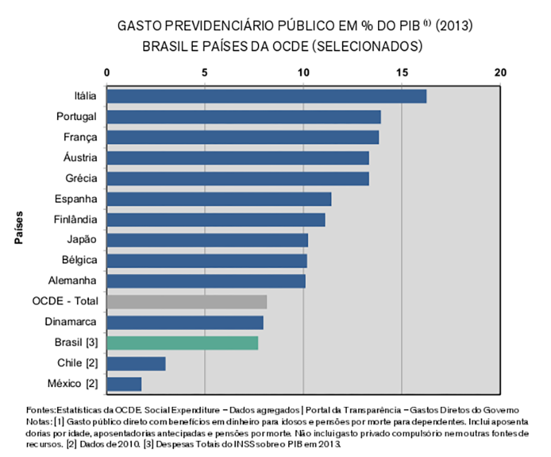 As despesas da Previdência Social brasileira, pública e universal, representam aproximadamente 8% do PIB (Produto Interno Bruto), segundo dados compilados pelo Dieese (Departamento Intersindical de Estatística e Estudos Socioeconômicos). A imprensa tradicional costuma indicar números maiores, que podem chegar a 14% do PIB. De qualquer maneira, o fato é que se trata de uma fatia do orçamento público em que os bancos não colocam a mão.