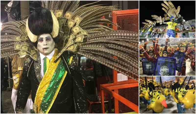 Se a comissão de frente da escola trouxe O grito da liberdade, mostrando escravos saídos da senzala açoitados, o último carro veio com um vampiro vestido com a faixa presidencial, que lembrava Michel Temer. Ele estava em cima do carro chamado neo tumbeiro, ou seja, um navio negreiro dos tempos atuais. Na avenida foram ouvidos gritos de "Fora, Temer", relatou o jornal O Globo. Entre o último e o primeiro carro, o desfile de 29 alas e 3.100 componentes ainda trouxe os manifestoches, integrantes vestidos de verde e amarelo, cor que marcou os protestos a favor do impeachment da ex-presidenta Dilma Rousseff, sendo manipulados por uma mão invisível e encaixados em patos amarelos, símbolo das reclamações contra o antigo Governo feitas pela Federação das Indústrias do Estado de São Paulo (FIESP). Eles carregavam nas mãos panelas, outro símbolo dos protestos.