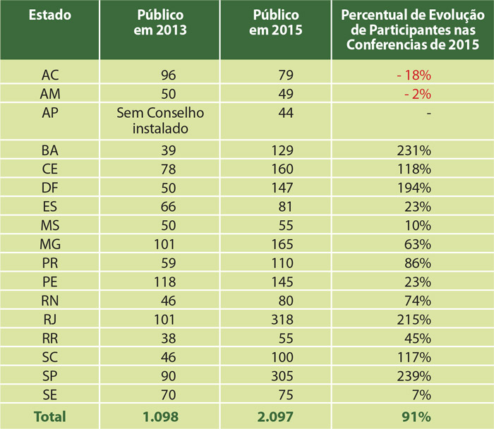 dos Sindicatos de Bancários, de entidades representativas locais e da Diretoria de Saúde e Rede de Atendimento, resultou na maior média de público por Conferência neste ano, aumentando, inclusive, a participação dos funcionários da ativa do BB. Os eventos reuniram 2.097 participantes neste ano, 91% a mais em comparação ao ano de 2013, onde o público foi de 1.098, conforme quadro comparativo de público nas Conferências realizadas nos anos de 2013 e 2015: